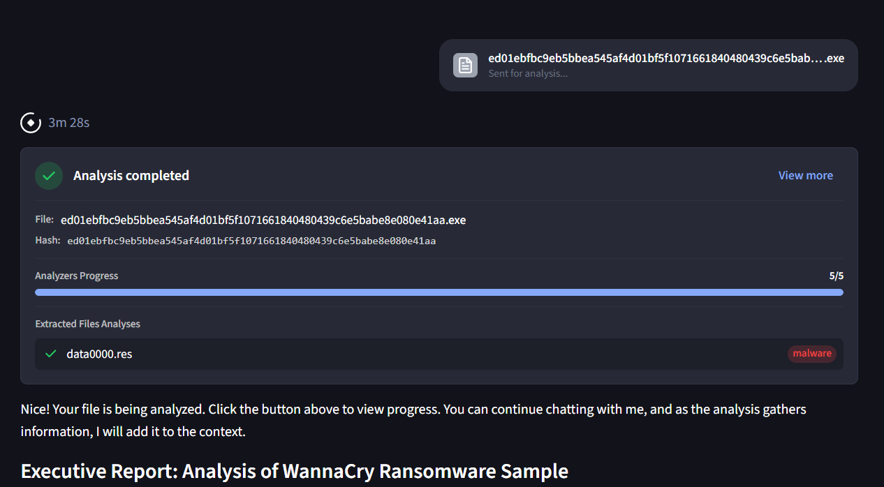 When you upload a file (for example, a .exe), Omnia automatically analyzes it and presents the results inside the platform.