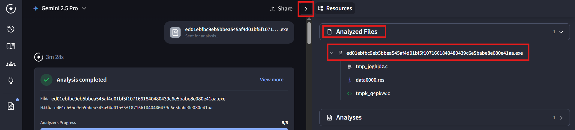 Once a file is uploaded, Omnia performs an initial analysis and surfaces key insights about the binary.