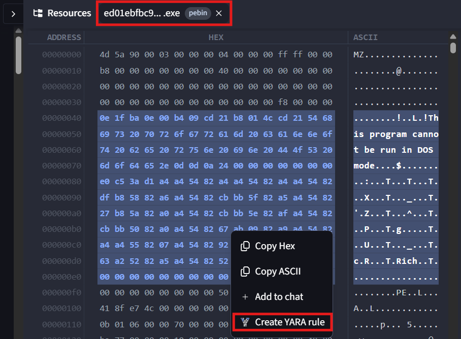 From there, you can inspect the binary at a low level and generate YARA rules with the help of AI—without leaving your workflow.