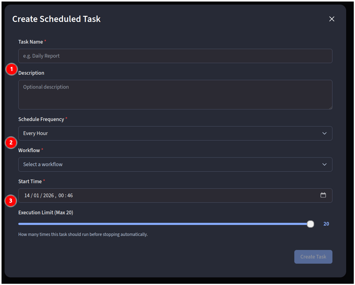 - Start date (the first execution) and how many times it will be executed. For example, if we set it for 2:00 p.m. on January 15 and have it run every hour, our workflow will run for the first time on January 15 at 2:00 p.m. every hour (up to a maximum of 20 times).
